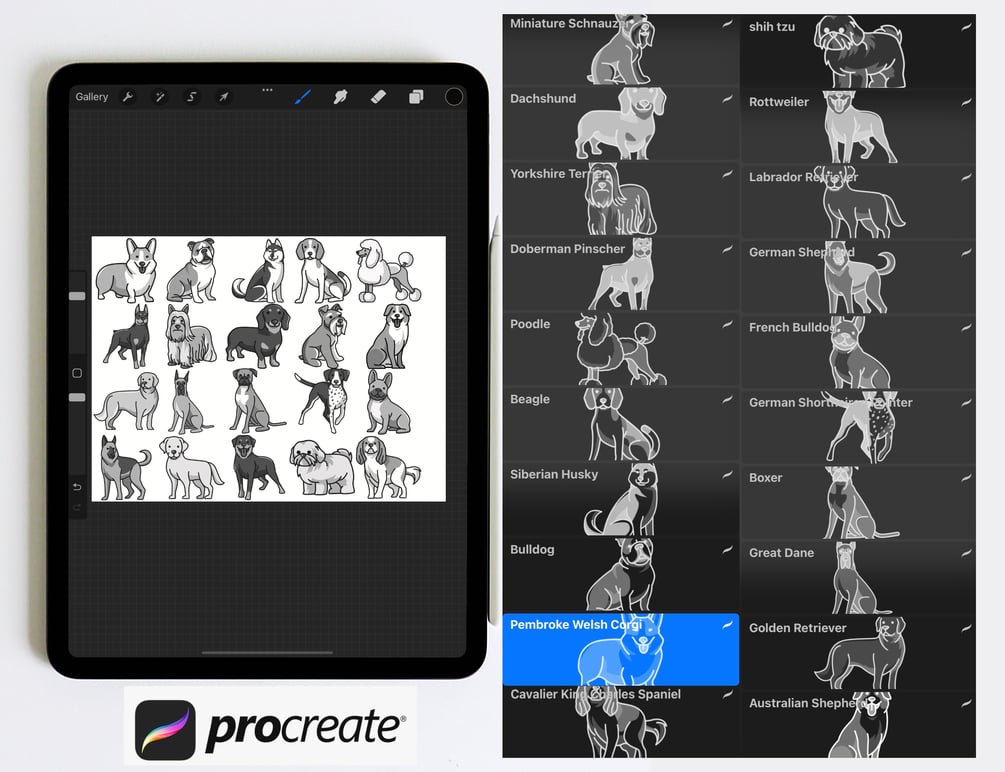 Pack of 20 Cartoon Dog Procreate Stamp Brushes! These cute dog stamps are perfect for making illustration projects or any procreate purpose. You can use these in any colour or opacity and they can be resized to best fit your art. You need Procreate 5.0.8 or 5X, an iPad, and an Apple Pencil. Also, these stamp brushes are not pressure sensitive and can be used with third party stylus, Apple Pencil or even your finger. You can change the colour, size and opacity of these stamps.
